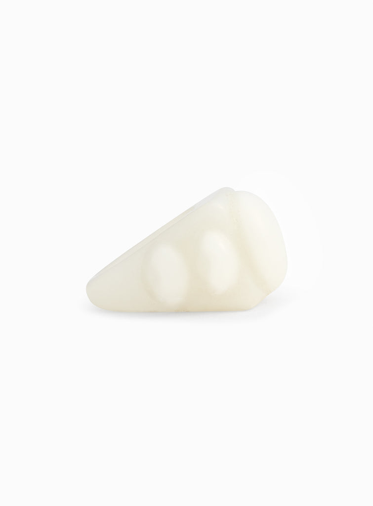 Every ALL IN TIBURONA ring is unique and has its own personality. These pieces are 3D printed in Barcelona using a material made from a mix of PLA (a bioplastic derived from renewable, organic resources) and organic elements from nature like scallop, sourced from Spain and France. This material transforms these elements into timeless jewelry.