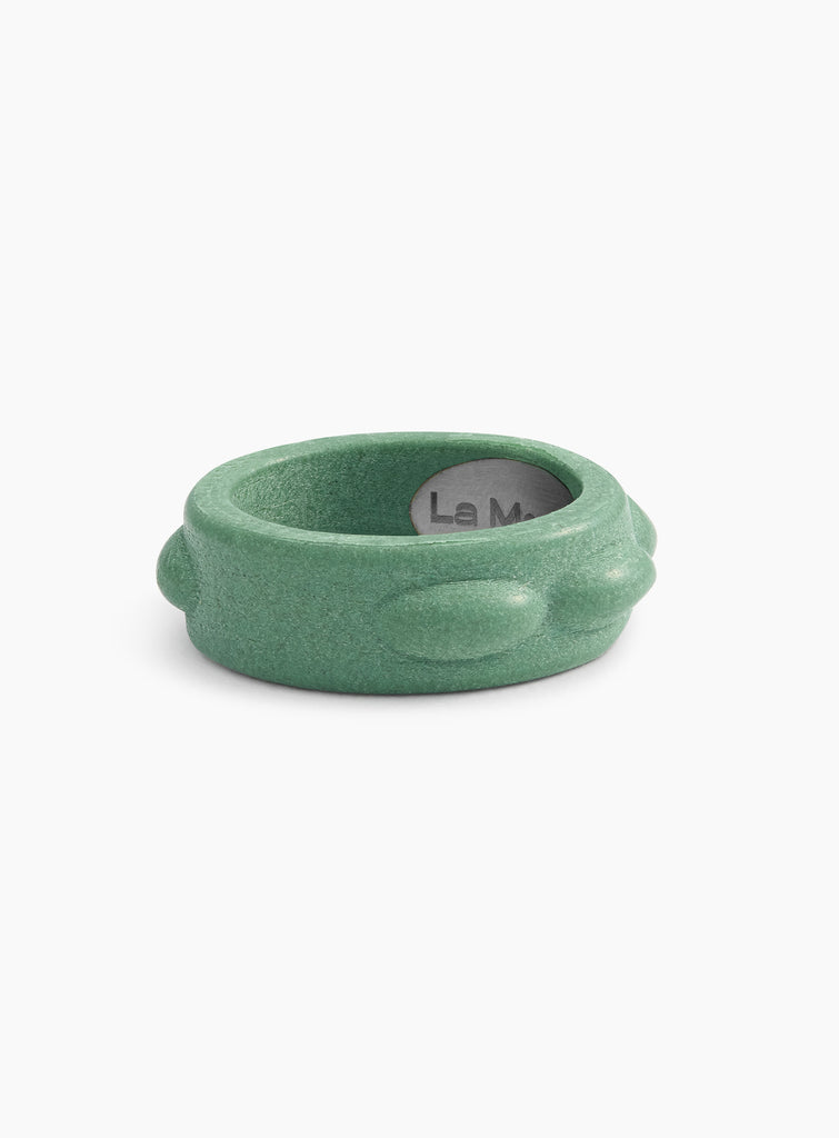 First Better Alone ring made from PLA and willow wood, which gives it a unique natural element and texture, along with a green finish