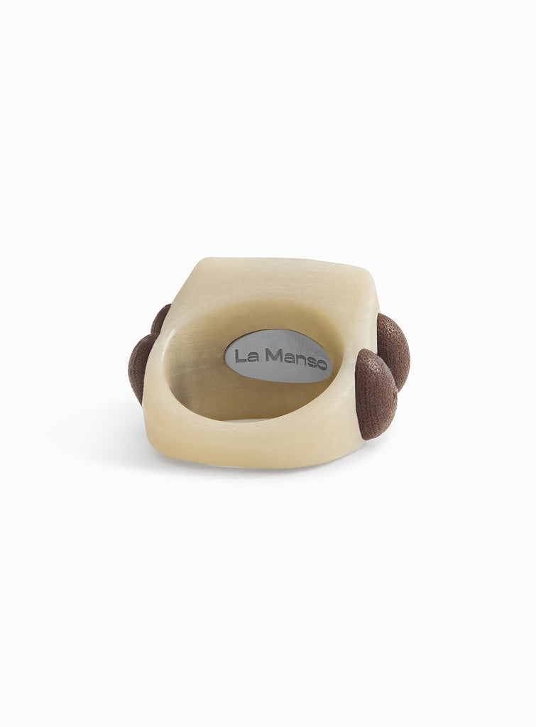 Gypsy dark brown oval, cork circle on a base of an off-white square ring.