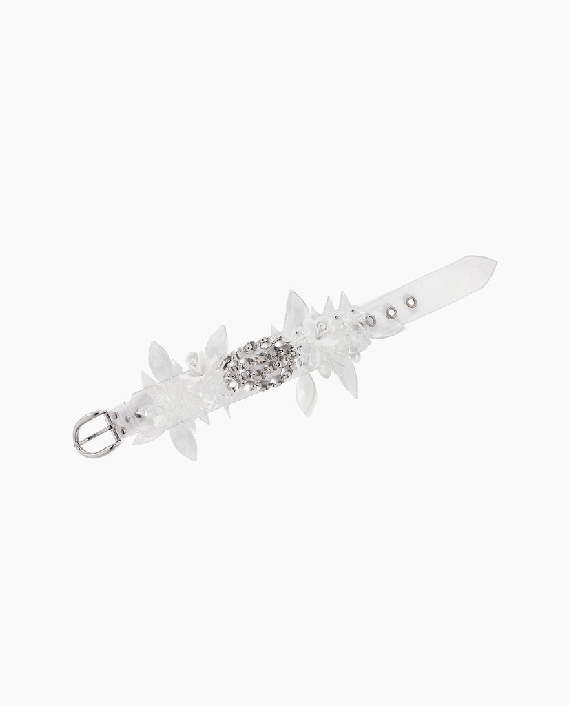 Necklace with embedded details, sewn into a 5 cm PVC thermoplastic strip. It features a finishing closure with a steel buckle and it's adjustable with three holes, each spaced 2 cm apart.