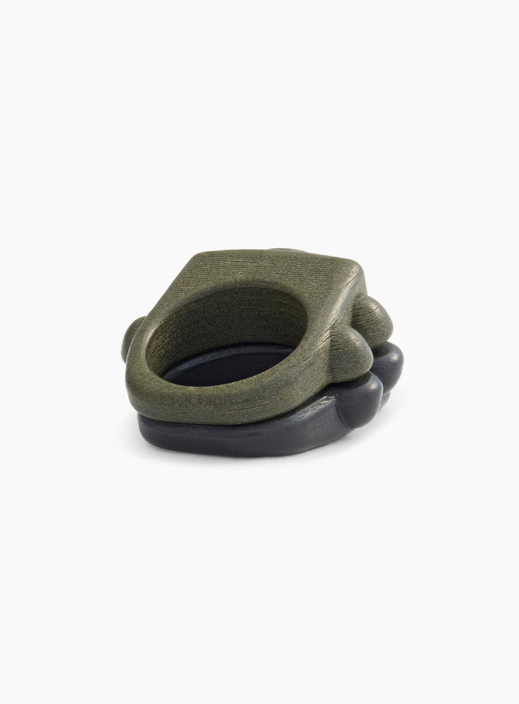First Half ring made from a blend of PLA, slate waste from the former quarries of Angers, and algae enriched with spirulina. By repurposing materials once deemed unusable, it transforms natural by-products into a distinctive and textured jewelry material, where earth and sea come together in harmony.