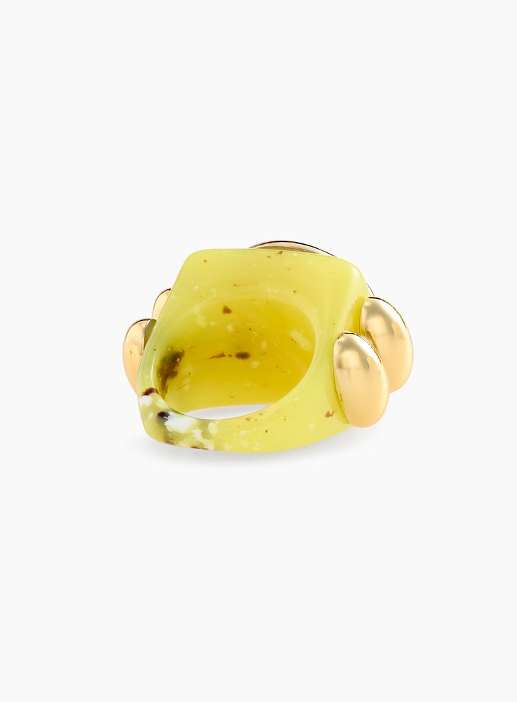 Gypsy gold oval, gold circle on a base of a yellow stone effect square ring.