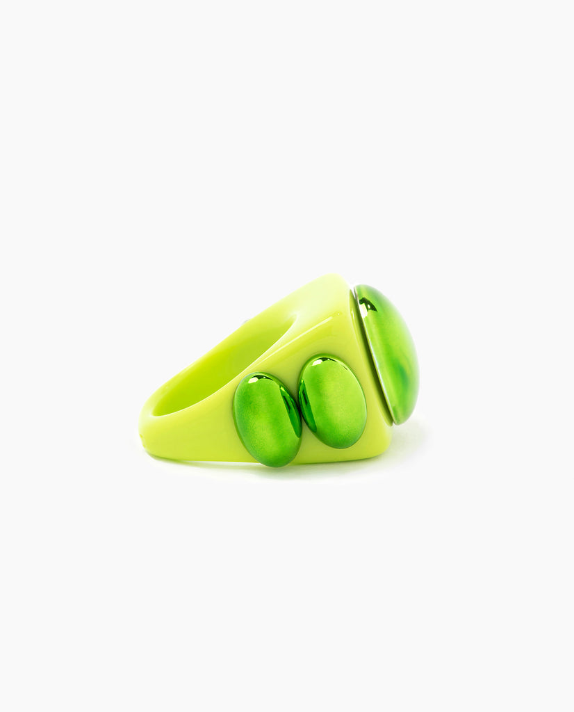 Gypsy fluor green oval, fluor green circle on a base of an acid green square ring.