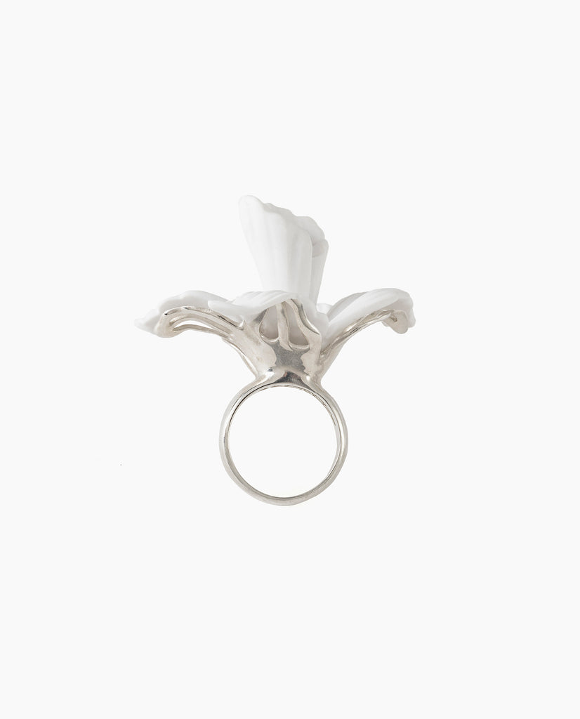 Deadstock vintage plastic flowers embedded in a brass piece plated in sterling silver 925.