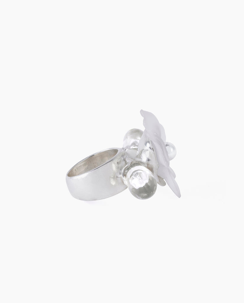 Deadstock vintage plastic flowers embedded in a brass piece plated in sterling silver 925.