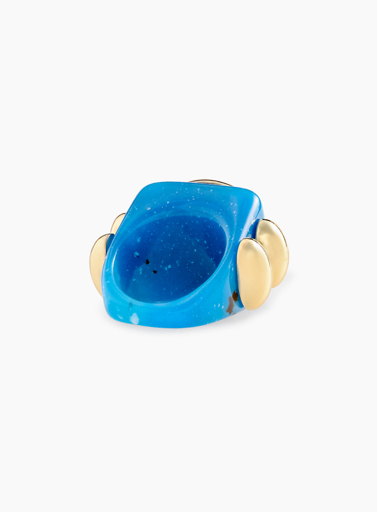 Gypsy gold oval, gold circle on a base of a dark blue stone effect square ring.