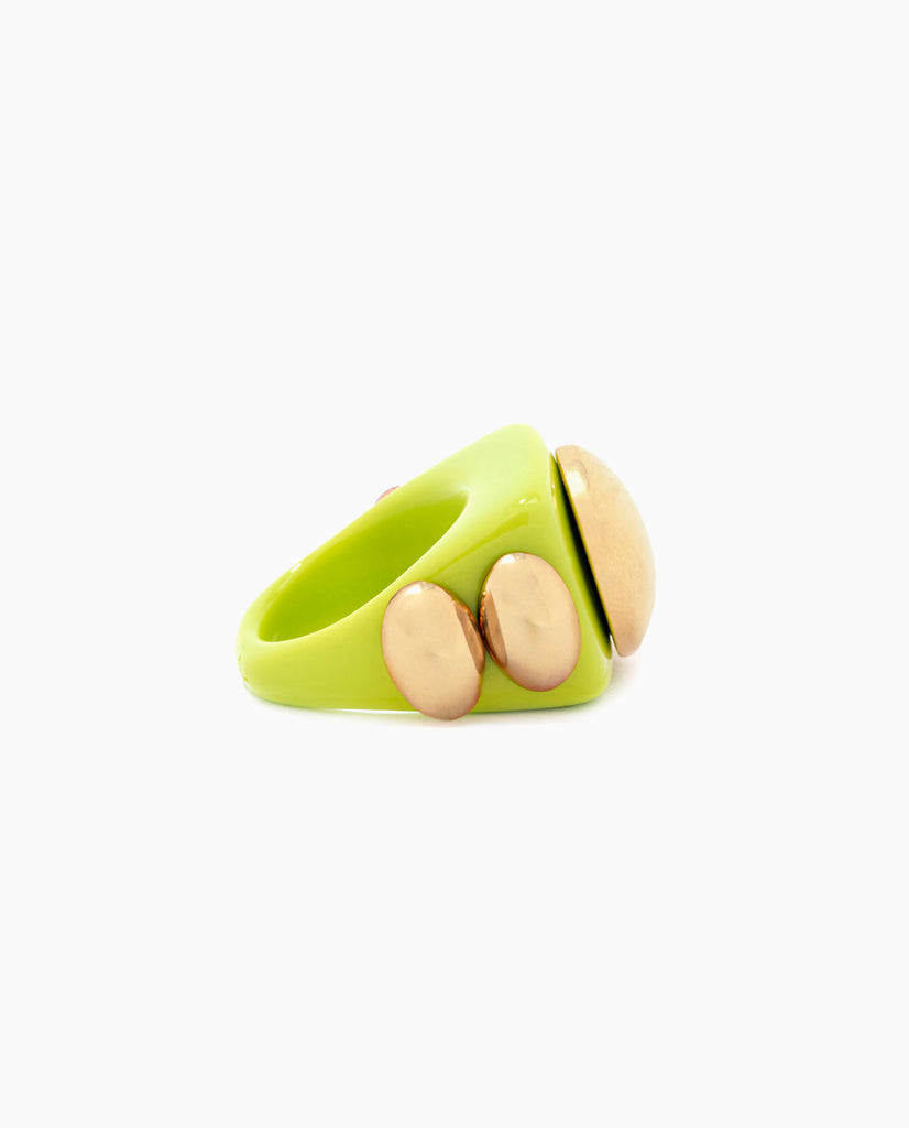 Gypsy gold oval, gold circle on a base of an acid green square ring.