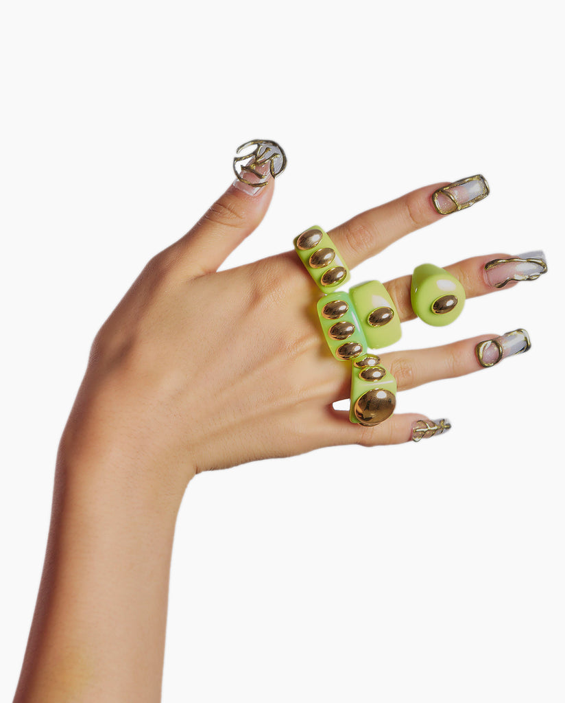 Look: Lime knuckle duster, Matcha mochi, Granny smith, Calipo knuckle duster, and Alien & Trapper.